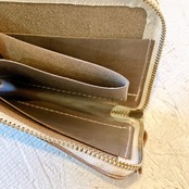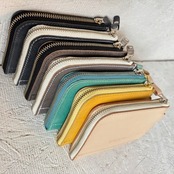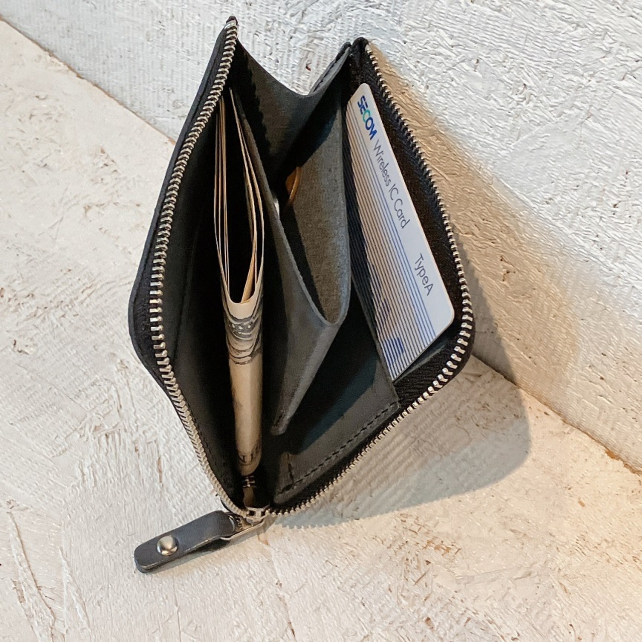 L字ファスナーを開けると、マチ付きで大きく口が広がる小銭入(試行錯誤した結果取り出しやすいよう浅く製作)れが中央にレイアウトされており、小銭入れに沿わせるように色々な収納の仕様ができる札入れスペースも確保。側面には左右合計10枚程度収納可能なカードホルダー、ワンアクションですべて取り出すことができるため、ミニウォレットにフレキシブルな機能性を求める方におすすめです。オン、オフ、問わない洗練されたルックスとスタイリッシュな形状が、これからの時代のニーズを捉えたプロダクトとして注目を集めています。
